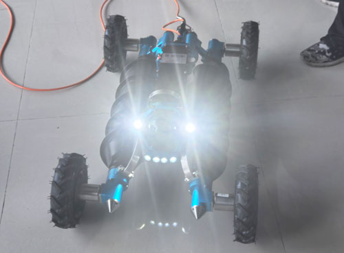 這款由武漢世隆科技自主研發的機器人,最大特點是具備"水陸兩棲"的全地形適應能力。其采用螺旋式與輪式雙推進系統設計,可根據作業環境自由切換推進模式——在堤岸等平地場景時,輪組驅動能實現快速機動;進入水面、泥沼或狹窄管渠時,輪組可自動折疊,通過螺旋式推進提升浮力與推力,確保在復雜環境中平穩作業。這一特性恰好適配汾河流域"堤岸-河道-管網"的多元監管場景,填補了傳統設備的應用空白。
